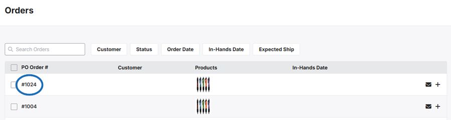 Each purchase order will be displayed with the PO Order Number, Customer, Product, and In-Hands Date. There are also two icons: