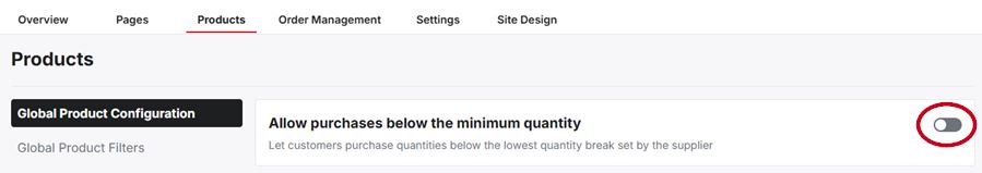 This area provides the option to allow customers to purchase quantities below the lowest quantity price break set by your computer (the supplier) by enabling this toggle.
