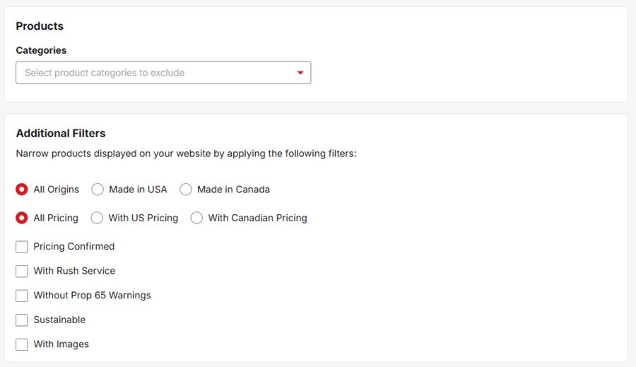 Below the category exclusion drop-down, you are able to narrow the products on your website by selecting from the "Additional Filters" section.