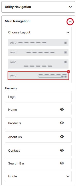 The utility navigation includes elements such as the search bar, a language selector, login link, social media, and contact information. The elements available on the utility navigation will vary depending on the selected layout. Each element will display with an "eye" icon to indicate whether it should be shown or hidden in the navigation. Additionally, if the element has an arrow, you can use it to expand the option and see the available layout choices for that element.